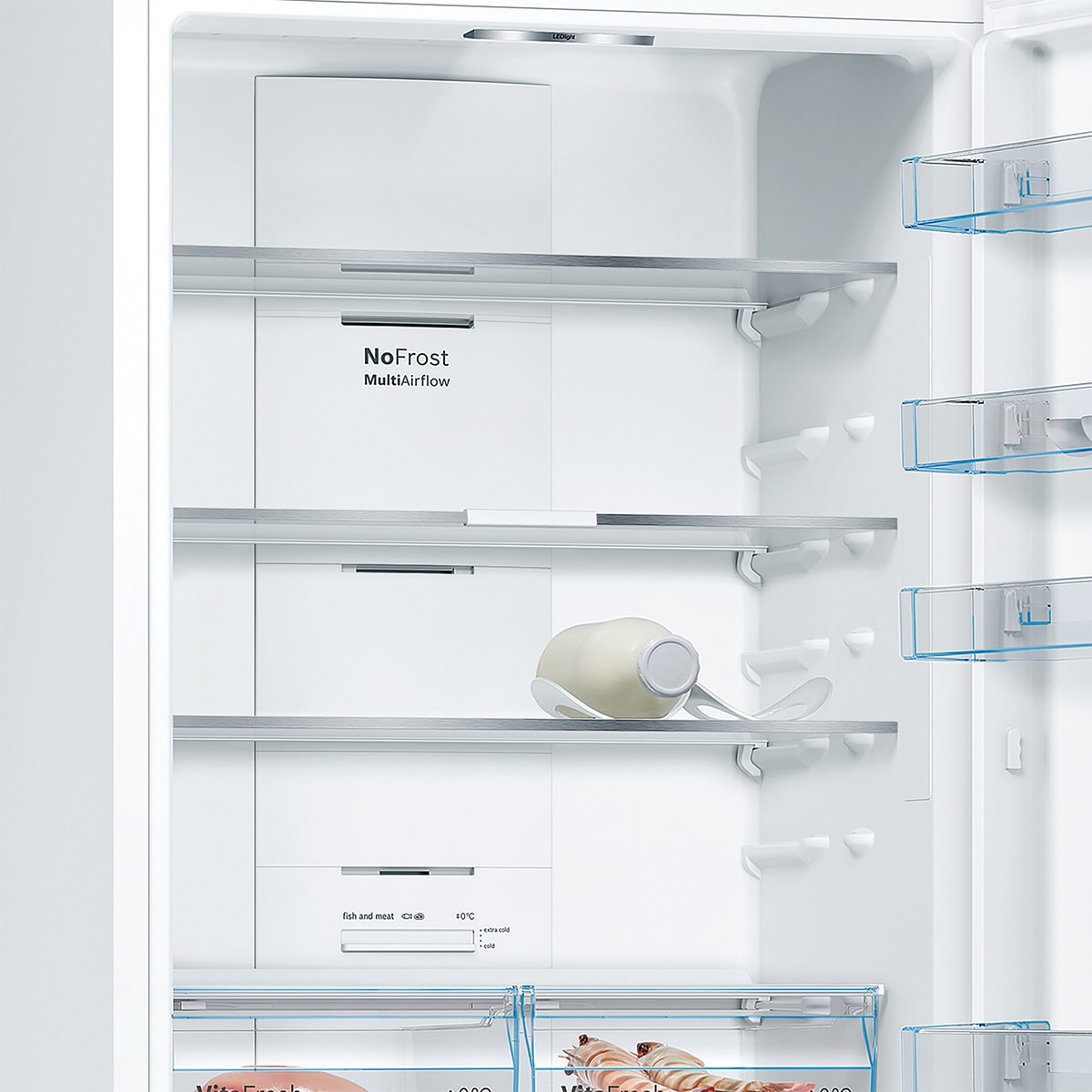 Total NoFrost, Combis libre instalac.. Consumos: Clase de eficiencia energética: D, dentro del rango de A (más eficiente) a G (menos eficiente); Volumen útil total: 438 l; Consumo anual de energía: 207 kWh/a; Capacidad de congelación 24h: 12 kg; Muy silencioso: 38 dB. Prestaciones: Total No Frost; Tecnología total No Frost MultiAir Flow; Visualización de la temperatura mediante LED; Iluminación interior LED con efecto SoftStart; Regulación independiente de temperatura en el frigorífico y congelador; Función "súper refrigeración" con desconexión automática; Función "súper congelación" con desconexión automática; Alarma óptica y acústica de puerta abierta; Señal acústica y óptica de avería y temperatura; Cajón VitaFresh con regulador de humedad para frutas y verduras; 2 cajones VitaFresh ?0°C?. Carnes y pescados frescos durante más tiempo; Bandejas de cristal EasyAccess con tope de seguridad en el refrigerador; Tiradores laterales integrados; Compresor: inverter compressor; 1 balcón grande, 3 balcones pequeños; 3 cajones transparentes en el congelador. Información técnica: Dimensiones del aparato (alto x ancho x fondo sin tirador): 203 x 70 x 67 cm; Puerta reversible; Clase Climática: SN-T; Tensión nominal: 220 - 240 V.; Posibilidad de unión de dos aparatos con el accesorio de unión correspondiente.